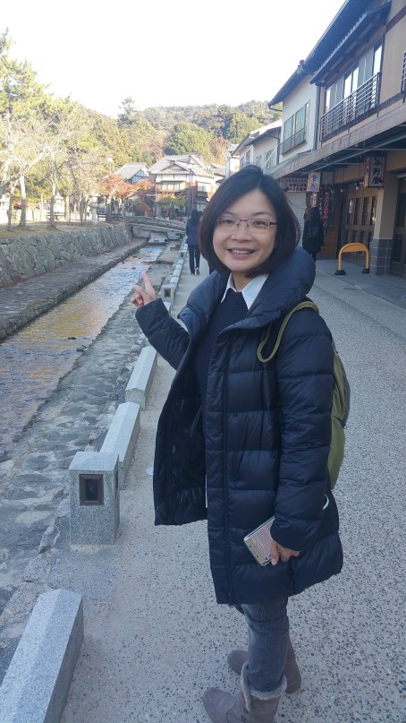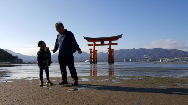 After the break, we reached Torii Gate and Itsukushima Shrine after a 10 mins stroll. Since it was low tide, we could walk down to the sand dune, close enough to have a close view of the Torii Gate. We walked across the bay.