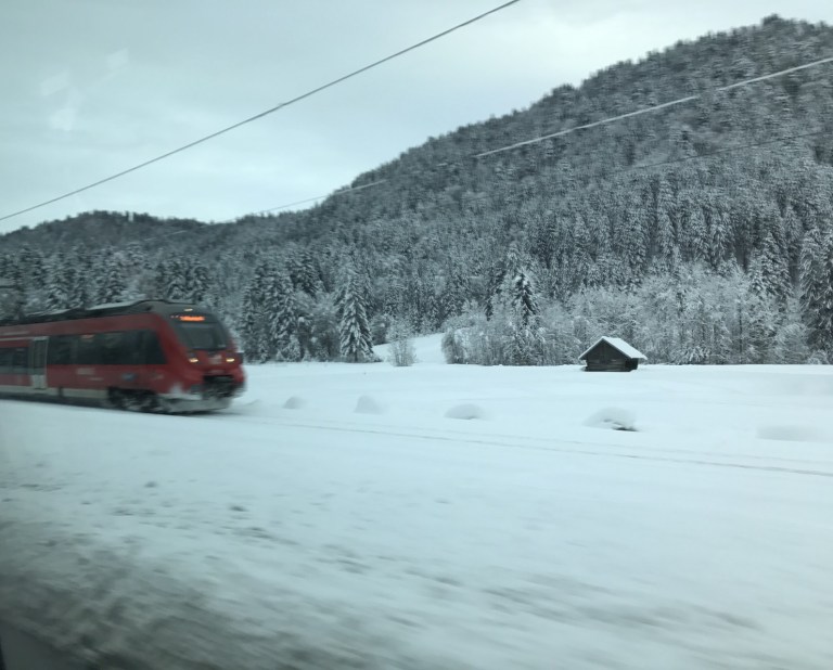 We arrived at Munich railway station at 5am, after an overnight train from Budapest. The car rental only opens at 6am and so we had our morning coffee at Starbucks while looking out the window towards Munich City.