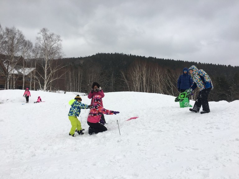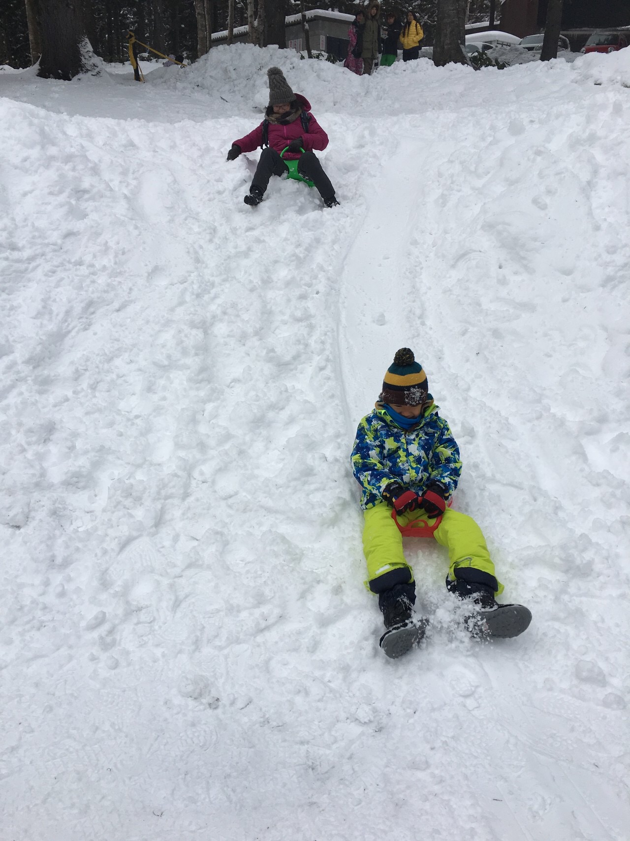 We did not stop sleding. Once we reached the tower resort, we found more slopes and people having fun in the snow. We took our sled out and we were having fun together with everyone else.