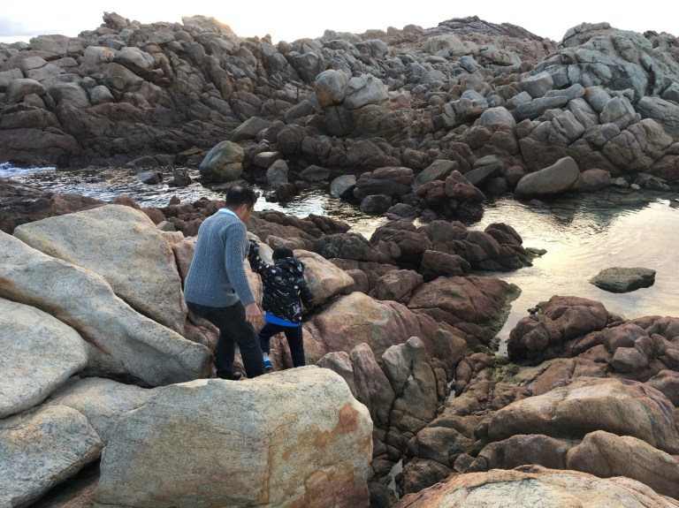 Uncle and Jaydon have a little adventure by climbing down the rocks.