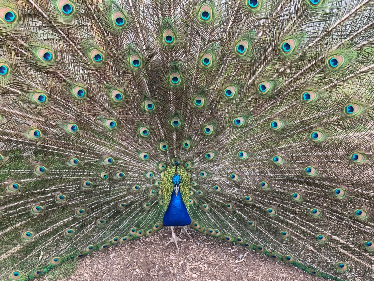 Magnificent Peacock which spending half his time chasing and scaring the surrounding chickens.